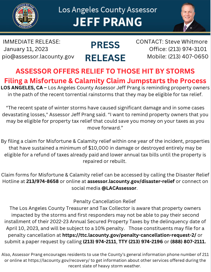 LA Tax Assessor Tax Relief due to Recent Torrential Rainstorms